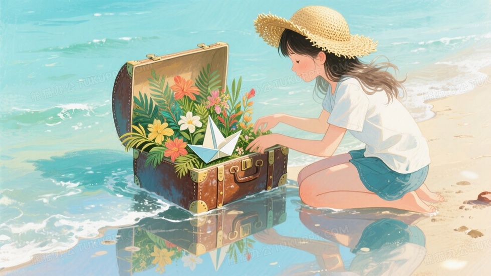 手绘水粉质感插画戴草编帽的少女跪坐沙滩开箱整理