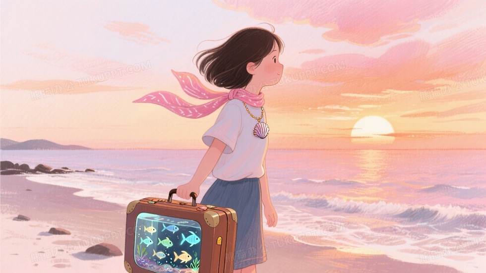 本作品内容为绘本风黄昏海滨场景女孩与行李箱并肩看日落, 格式为 jpg, 大小1 MB, 图片尺寸为1664 x 936, 源文件无水印, 欢迎使用熊猫办公。 如认为平台内容涉嫌侵权,可通过邮件:tousu@tukuppt.com提出书面通知,我们将及时处理。