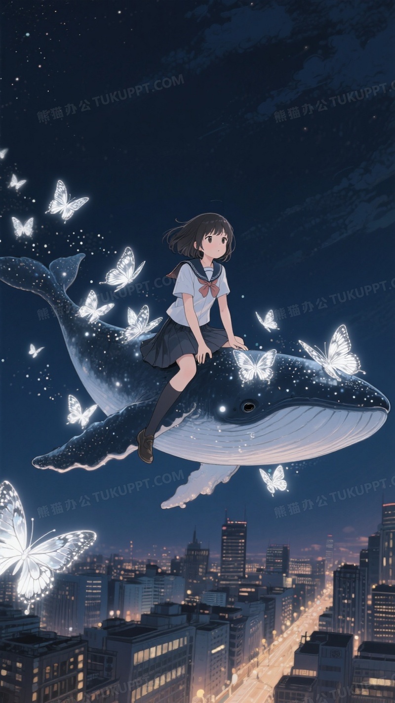 本作品内容为日系插画晚上一个女学生坐在飞越城市的鲸鱼上, 格式为 jpg, 大小1 MB, 图片尺寸为936 x 1664, 源文件无水印, 欢迎使用熊猫办公。 如认为平台内容涉嫌侵权,可通过邮件:tousu@tukuppt.com提出书面通知,我们将及时处理。