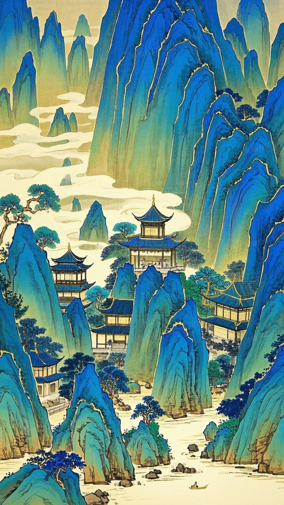 本作品内容为中国山水画工笔山体边缘线为金色线条, 格式为 jpg, 大小3 MB, 图片尺寸为2304 x 4096, 源文件无水印, 欢迎使用熊猫办公。 如认为平台内容涉嫌侵权,可通过邮件:tousu@tukuppt.com提出书面通知,我们将及时处理。