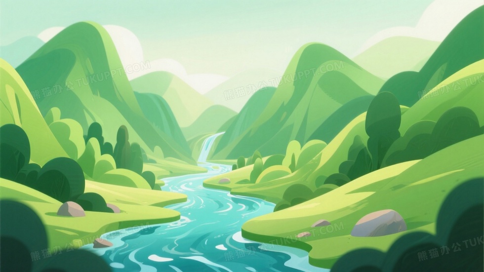 本作品内容为好看的高清卡通插画绿色的山川和溪流构成美丽画卷, 格式为 jpg, 大小1 MB, 图片尺寸为1664 x 936, 源文件无水印, 欢迎使用熊猫办公。 如认为平台内容涉嫌侵权,可通过邮件:tousu@tukuppt.com提出书面通知,我们将及时处理。