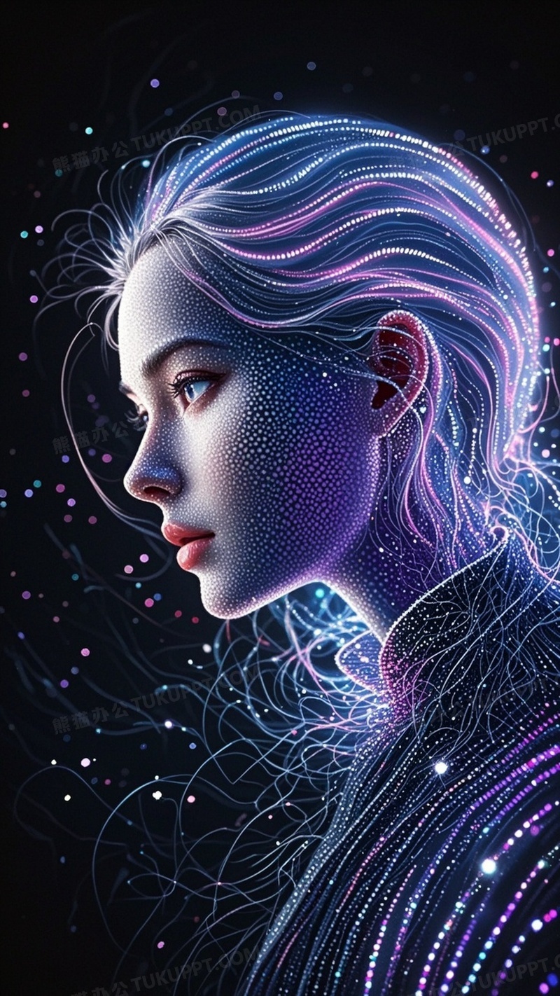 本作品内容为点线粒子凝聚一丝丝虚拟数字点勾勒出人物轮廓, 格式为 jpg, 大小1 MB, 图片尺寸为1152 x 2048, 作品中背景图片无需修改, 源文件无水印,可以直接使用, 欢迎使用熊猫办公。 如认为平台内容涉嫌侵权,可通过邮件:tousu@tukuppt.com提出书面通知,我们将及时处理。