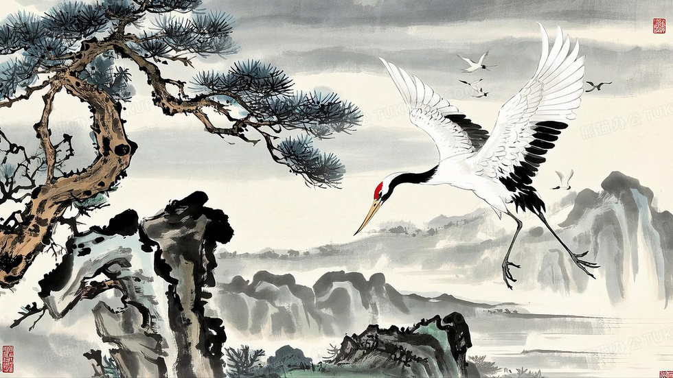 本作品内容为中国水墨风白鹤松树场景插画, 格式为 jpg, 大小3 MB, 图片尺寸为2720 x 1530, 源文件无水印, 欢迎使用熊猫办公。 如认为平台内容涉嫌侵权,可通过邮件:tousu@tukuppt.com提出书面通知,我们将及时处理。