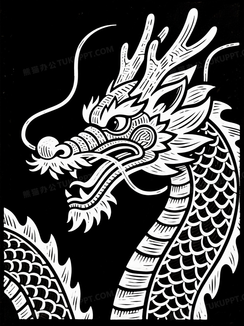 本作品内容为中国龙黑底白线绘制矢量插画风格, 格式为 jpg, 大小1 MB, 图片尺寸为1104 x 1472, 源文件无水印, 欢迎使用熊猫办公。 如认为平台内容涉嫌侵权,可通过邮件:tousu@tukuppt.com提出书面通知,我们将及时处理。