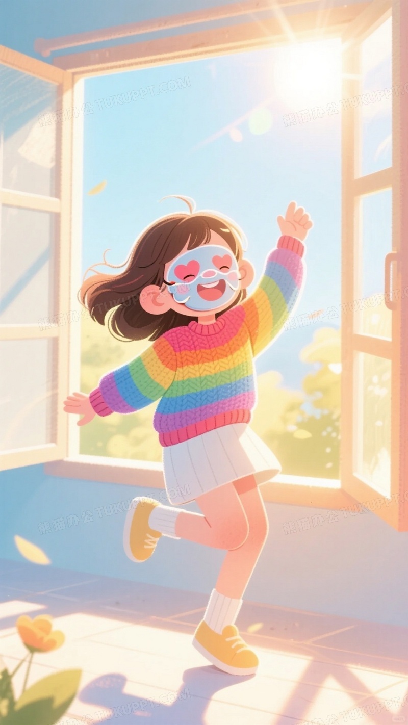 本作品内容为治愈系卡通插画女孩穿着彩虹毛衣开心地敷着爱心面膜, 格式为 jpg, 大小1 MB, 图片尺寸为936 x 1664, 源文件无水印, 欢迎使用熊猫办公。 如认为平台内容涉嫌侵权,可通过邮件:tousu@tukuppt.com提出书面通知,我们将及时处理。
