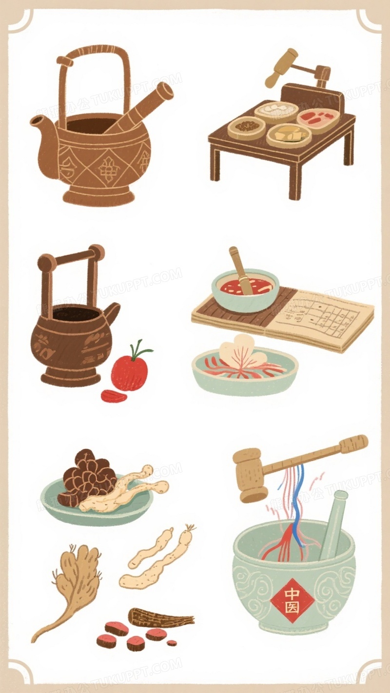 本作品内容为中医元素插画药材传统器具, 格式为 jpg, 大小1 MB, 图片尺寸为936 x 1664, 源文件无水印, 欢迎使用熊猫办公。 如认为平台内容涉嫌侵权,可通过邮件:tousu@tukuppt.com提出书面通知,我们将及时处理。