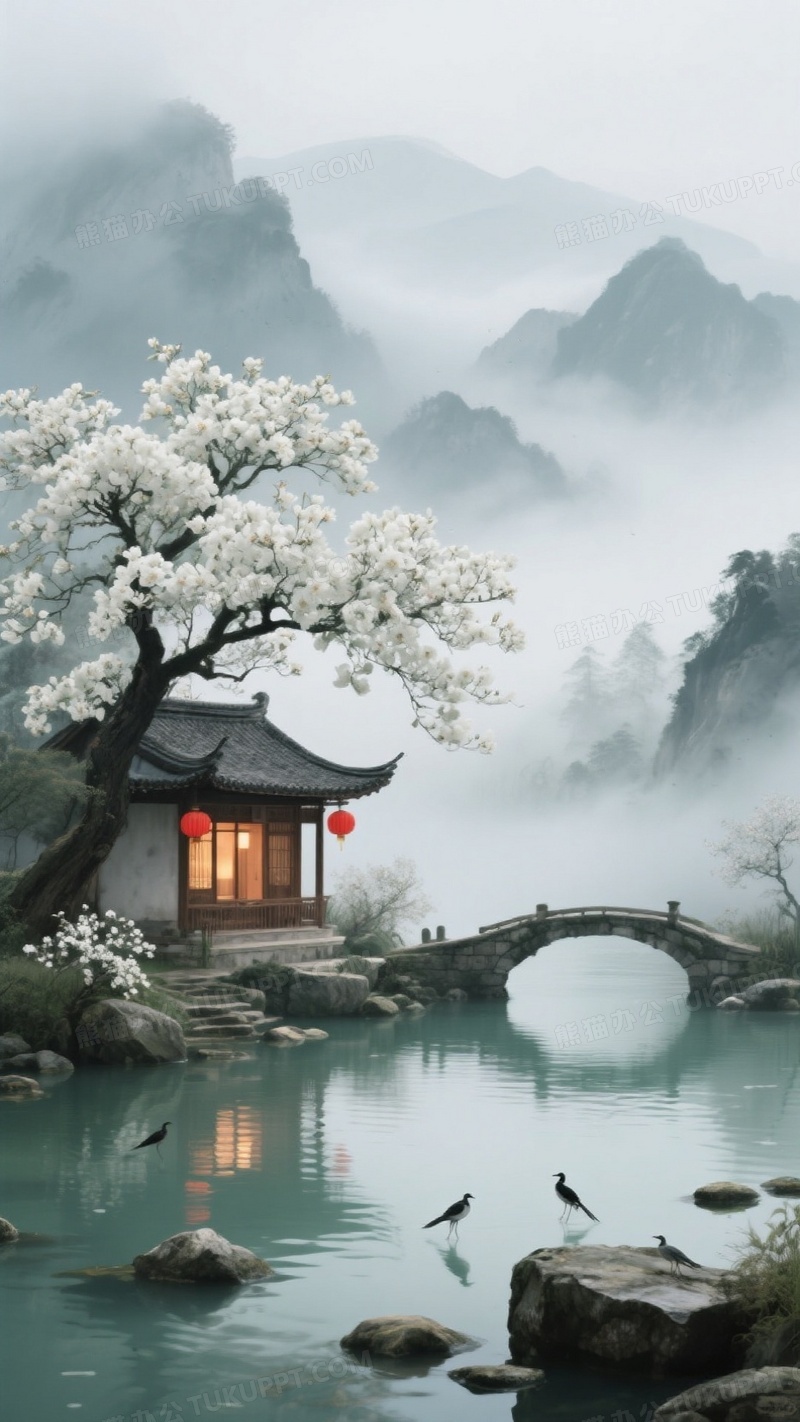 本作品内容为画面展现了一幅中式山水意境图, 格式为 jpg, 大小1 MB, 图片尺寸为936 x 1664, 源文件无水印, 欢迎使用熊猫办公。 如认为平台内容涉嫌侵权,可通过邮件:tousu@tukuppt.com提出书面通知,我们将及时处理。