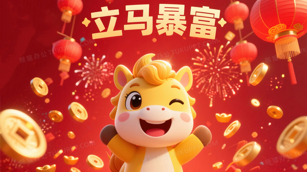 本作品内容为马年新年创意壁纸立马暴富卡通马插画, 格式为 jpg, 大小6 MB, 图片尺寸为3328 x 1872, 源文件无水印, 欢迎使用熊猫办公。 如认为平台内容涉嫌侵权,可通过邮件:tousu@tukuppt.com提出书面通知,我们将及时处理。