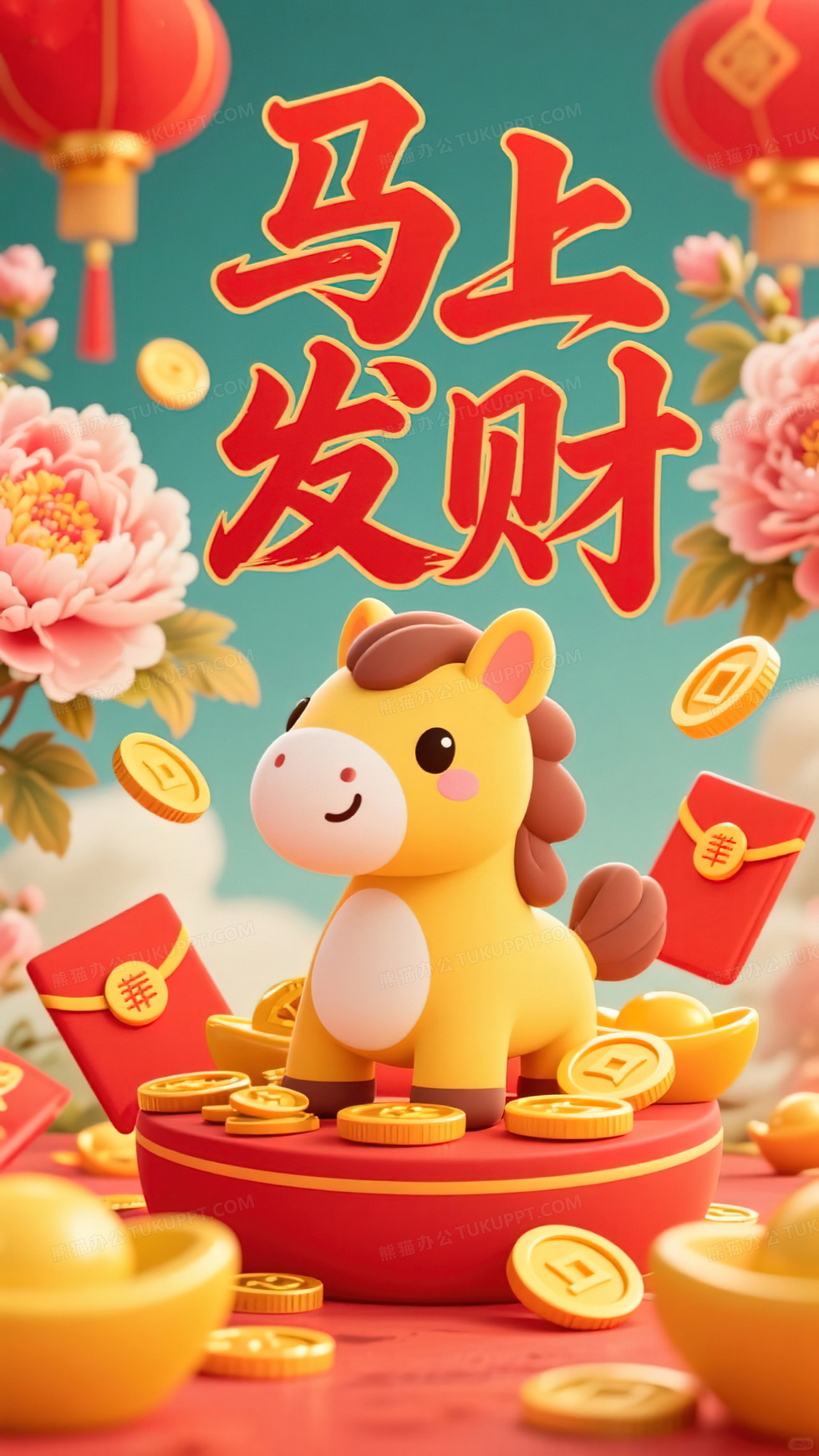 本作品内容为马年新年创意壁纸马上发财插画, 格式为 jpg, 大小6 MB, 图片尺寸为1872 x 3328, 源文件无水印, 欢迎使用熊猫办公。 如认为平台内容涉嫌侵权,可通过邮件:tousu@tukuppt.com提出书面通知,我们将及时处理。