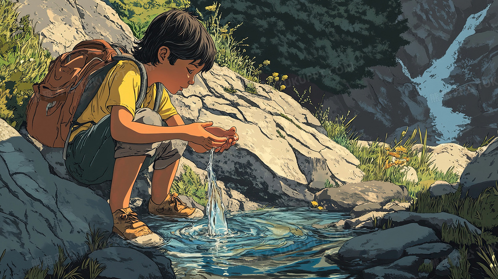 首页 > 插画 > 科技艺术 > 水彩手绘 > 卡通风河边双手捧着水的男孩插画