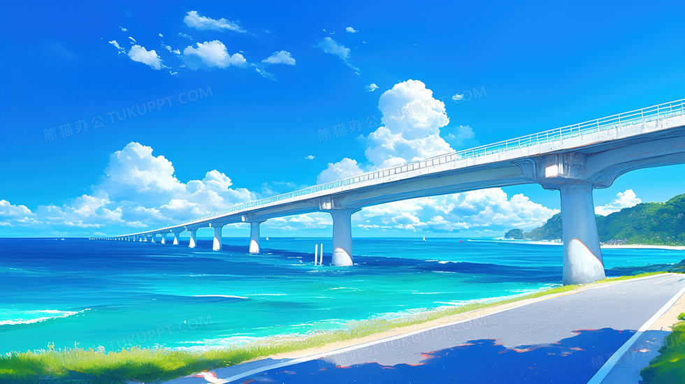 本作品内容为跨海大桥海边风景蓝天白云插画, 格式为 jpg, 大小3 MB, 图片尺寸为2912 x 1632, 源文件无水印, 欢迎使用熊猫办公。 如认为平台内容涉嫌侵权,可通过邮件:tousu@tukuppt.com提出书面通知,我们将及时处理。