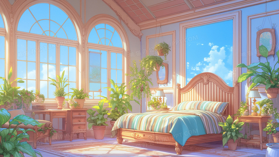 本作品内容为摆放在房间卧室里的装饰绿植盆栽插画, 格式为 jpg, 大小3 MB, 图片尺寸为2912 x 1632, 源文件无水印, 欢迎使用熊猫办公。 如认为平台内容涉嫌侵权,可通过邮件:tousu@tukuppt.com提出书面通知,我们将及时处理。