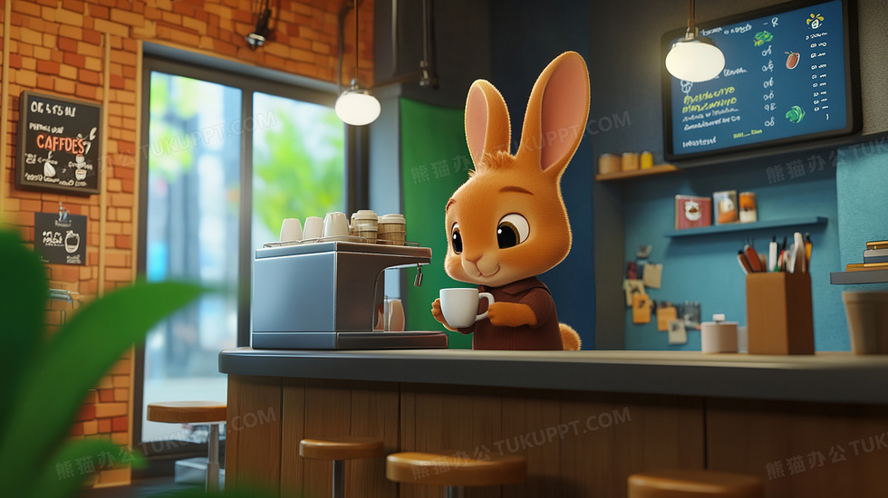 本作品内容为咖啡店内做咖啡的兔子职员插画, 格式为 jpg, 大小3 MB, 图片尺寸为2912 x 1632, 源文件无水印, 欢迎使用熊猫办公。 如认为平台内容涉嫌侵权,可通过邮件:tousu@tukuppt.com提出书面通知,我们将及时处理。
