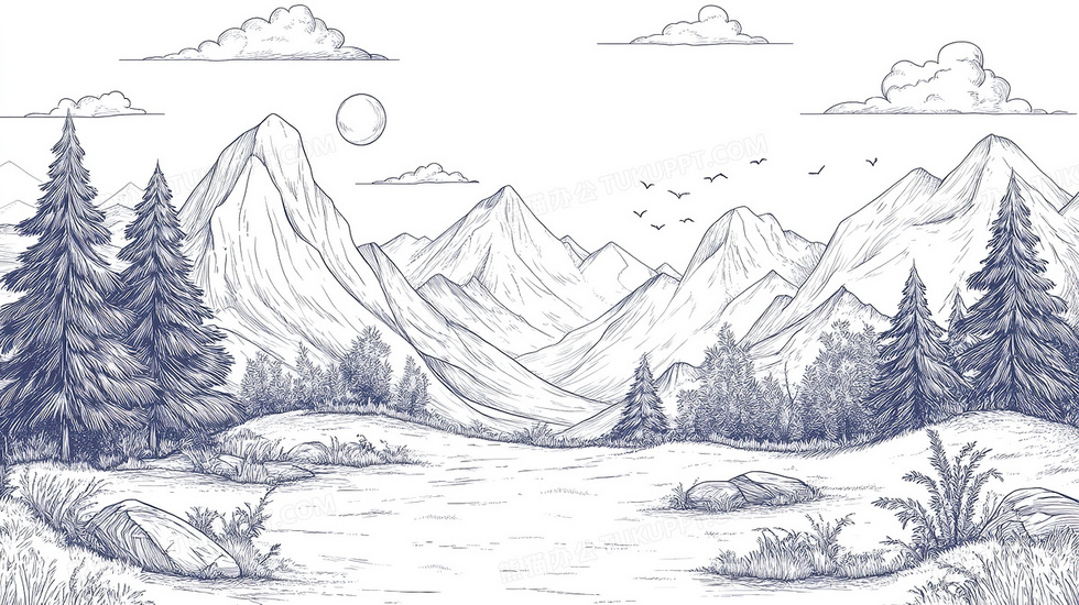 本作品内容为白描素描手绘自然风景插画, 格式为 jpg, 大小4 MB, 图片尺寸为2912 x 1632, 源文件无水印, 欢迎使用熊猫办公。 如认为平台内容涉嫌侵权,可通过邮件:tousu@tukuppt.com提出书面通知,我们将及时处理。