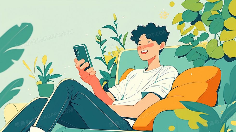 本作品内容为室内绿植围绕坐在沙发玩手机卡通男孩插画, 格式为 jpg, 大小2 MB, 图片尺寸为2912 x 1632, 源文件无水印, 欢迎使用熊猫办公。 如认为平台内容涉嫌侵权,可通过邮件:tousu@tukuppt.com提出书面通知,我们将及时处理。