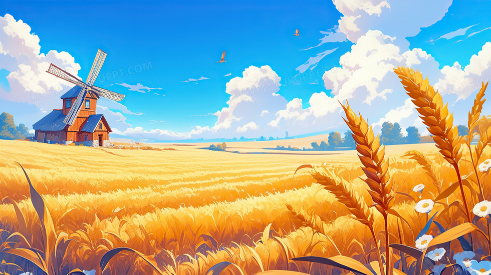 本作品内容为风吹麦浪唯美风景插画, 格式为 jpg, 大小4 MB, 图片尺寸为2912 x 1632, 源文件无水印, 欢迎使用熊猫办公。 如认为平台内容涉嫌侵权,可通过邮件:tousu@tukuppt.com提出书面通知,我们将及时处理。
