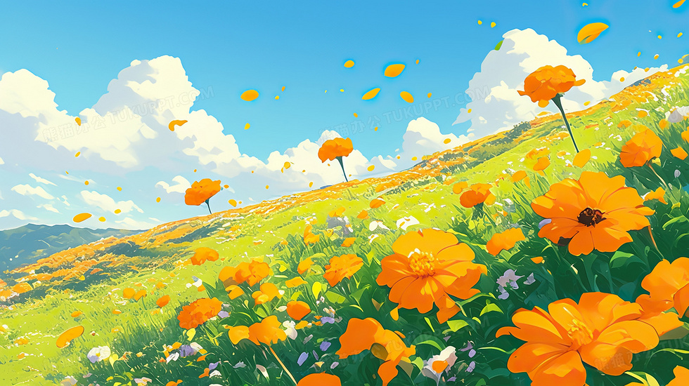 本作品内容为盛开的金盏花丛唯美风景插画, 格式为 jpg, 大小4 MB, 图片尺寸为2912 x 1632, 源文件无水印, 欢迎使用熊猫办公。 如认为平台内容涉嫌侵权,可通过邮件:tousu@tukuppt.com提出书面通知,我们将及时处理。
