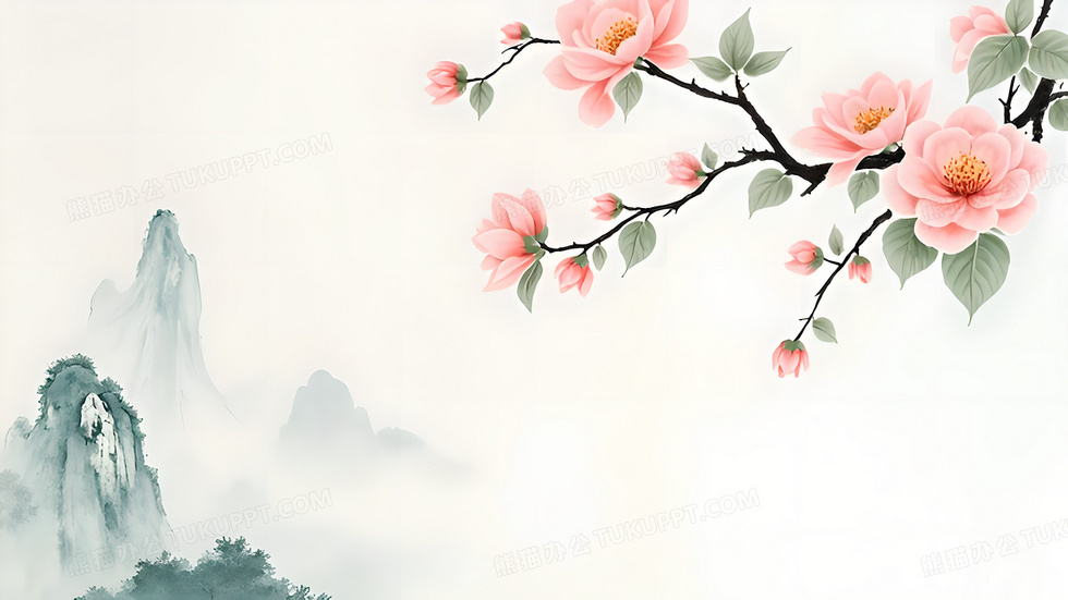 本作品内容为水彩国风建筑和山茶花AI背景, 格式为 jpg, 大小3 MB, 图片尺寸为3072 x 1728, 作品中背景图片无需修改, 源文件无水印,可以直接使用, 欢迎使用熊猫办公。 如认为平台内容涉嫌侵权,可通过邮件:tousu@tukuppt.com提出书面通知,我们将及时处理。