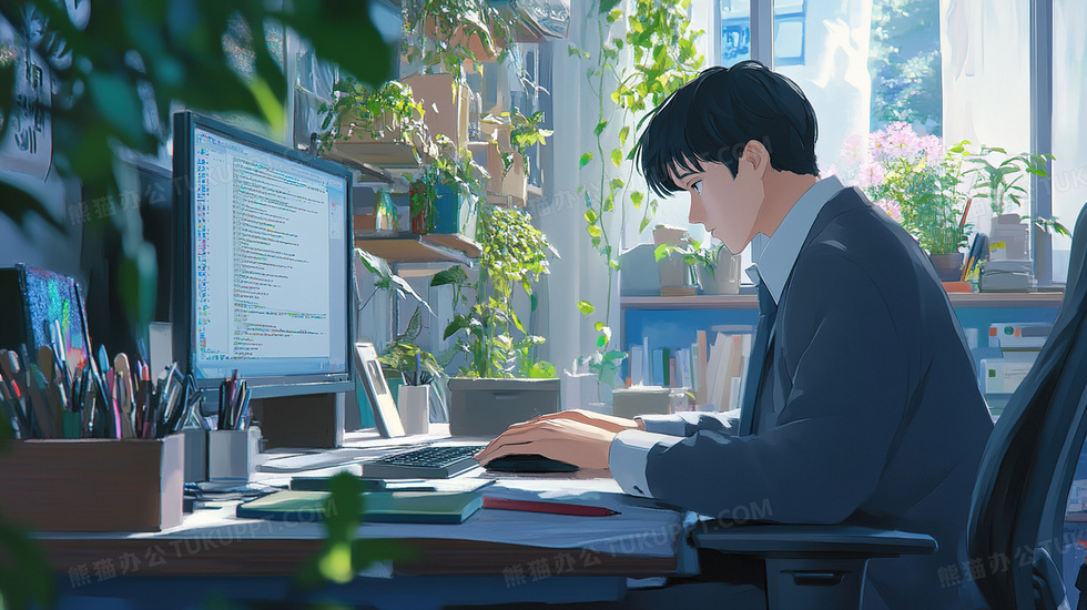 本作品内容为办公室电脑前办公的男职员插画, 格式为 jpg, 大小3 MB, 图片尺寸为2912 x 1632, 源文件无水印, 欢迎使用熊猫办公。 如认为平台内容涉嫌侵权,可通过邮件:tousu@tukuppt.com提出书面通知,我们将及时处理。