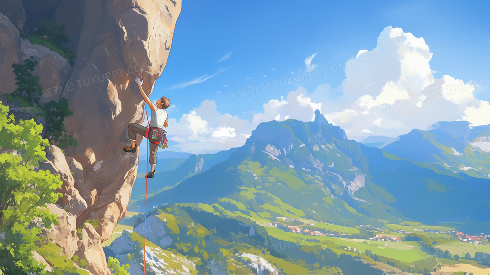 本作品内容为蓝天白云极限运动攀岩登山大自然插画, 格式为 jpg, 大小3 MB, 图片尺寸为2912 x 1632, 源文件无水印, 欢迎使用熊猫办公。 如认为平台内容涉嫌侵权,可通过邮件:tousu@tukuppt.com提出书面通知,我们将及时处理。