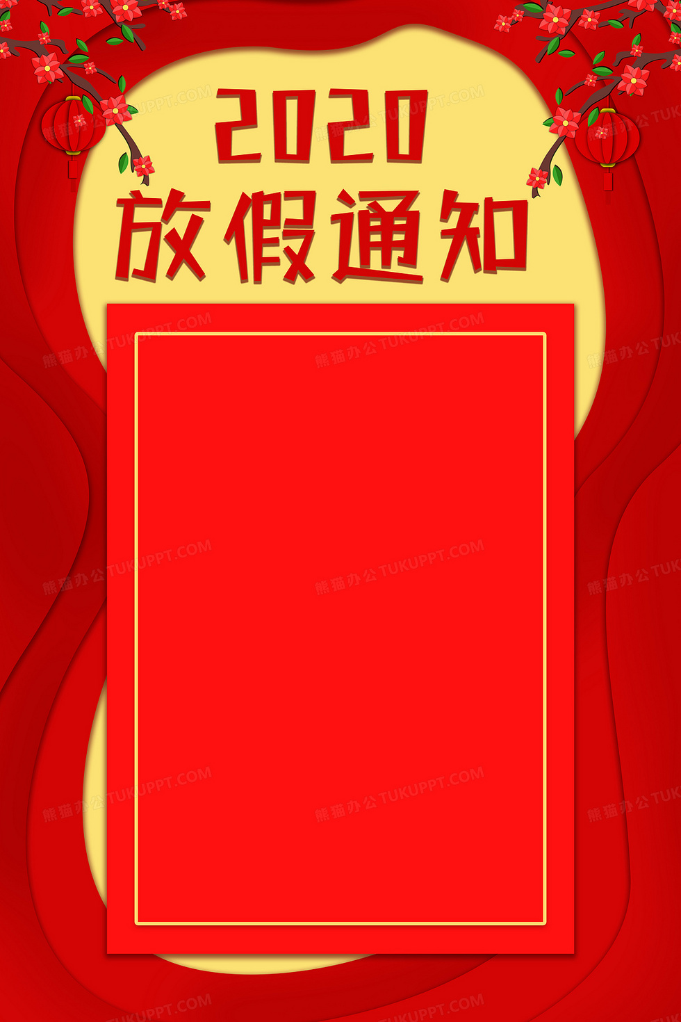 本作品内容为喜庆新年放假通知背景, 格式为 psd, 大小57 MB, 图片尺寸为7087 x 10630, 作品中背景图片无需修改, 源文件无水印,可以直接使用, 欢迎使用熊猫办公。 如认为平台内容涉嫌侵权,可通过邮件:tousu@tukuppt.com提出书面通知,我们将及时处理。