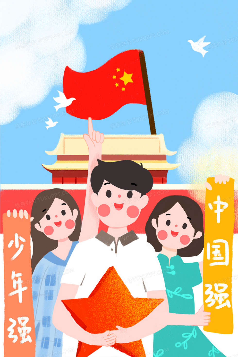 本作品内容为庆祝国庆国旗下宣誓手绘插画, 格式为 psd, 大小15 MB, 图片尺寸为2341 x 3508, 作品中背景图片无需修改, 源文件无水印,可以直接使用, 欢迎使用熊猫办公。 如认为平台内容涉嫌侵权,可通过邮件:tousu@tukuppt.com提出书面通知,我们将及时处理。