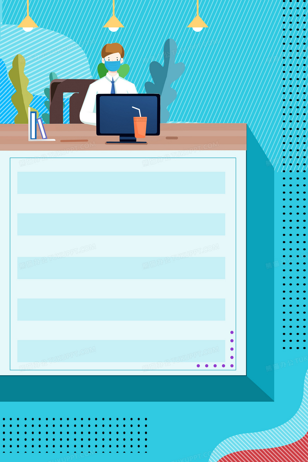 本作品内容为复工防疫办公场景简约背景, 格式为 psd, 大小14 MB, 图片尺寸为3543 x 5315, 作品中背景图片无需修改, 源文件无水印,可以直接使用, 欢迎使用熊猫办公。 如认为平台内容涉嫌侵权,可通过邮件:tousu@tukuppt.com提出书面通知,我们将及时处理。