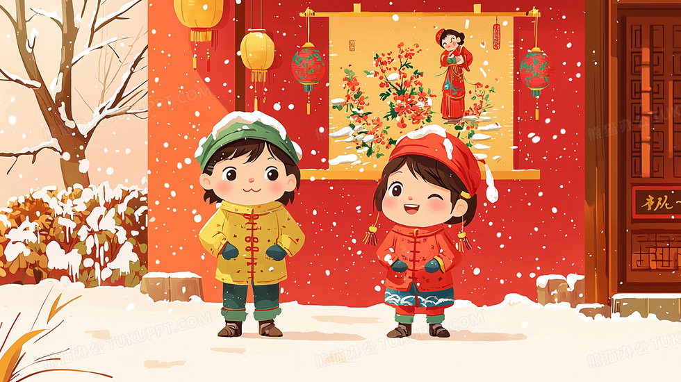 本作品内容为春节下雪天雪地里的卡通男孩女孩插画, 格式为 jpg, 大小3 MB, 图片尺寸为2912 x 1632, 源文件无水印, 欢迎使用熊猫办公。 如认为平台内容涉嫌侵权,可通过邮件:tousu@tukuppt.com提出书面通知,我们将及时处理。