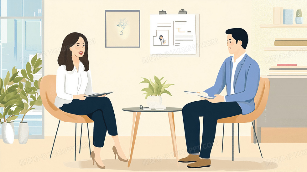 本作品内容为招聘纳新面试交谈的商务人士插画, 格式为 jpg, 大小2 MB, 图片尺寸为2912 x 1632, 源文件无水印, 欢迎使用熊猫办公。 如认为平台内容涉嫌侵权,可通过邮件:tousu@tukuppt.com提出书面通知,我们将及时处理。