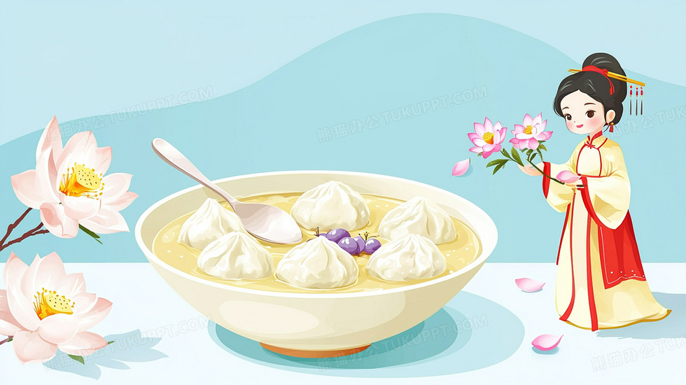 本作品内容为卡通中餐美食包子古风女孩背景, 格式为 jpg, 大小2 MB, 图片尺寸为2912 x 1632, 作品中背景图片无需修改, 源文件无水印,可以直接使用, 欢迎使用熊猫办公。 如认为平台内容涉嫌侵权,可通过邮件:tousu@tukuppt.com提出书面通知,我们将及时处理。