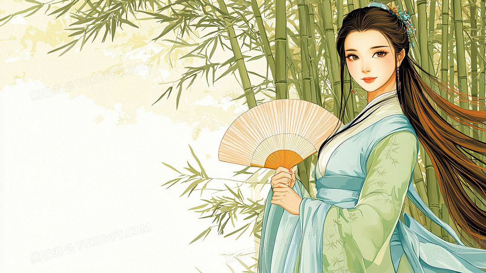 本作品内容为卡通手拿折扇古风女子竹林背景, 格式为 jpg, 大小3 MB, 图片尺寸为2912 x 1632, 作品中背景图片无需修改, 源文件无水印,可以直接使用, 欢迎使用熊猫办公。 如认为平台内容涉嫌侵权,可通过邮件:tousu@tukuppt.com提出书面通知,我们将及时处理。
