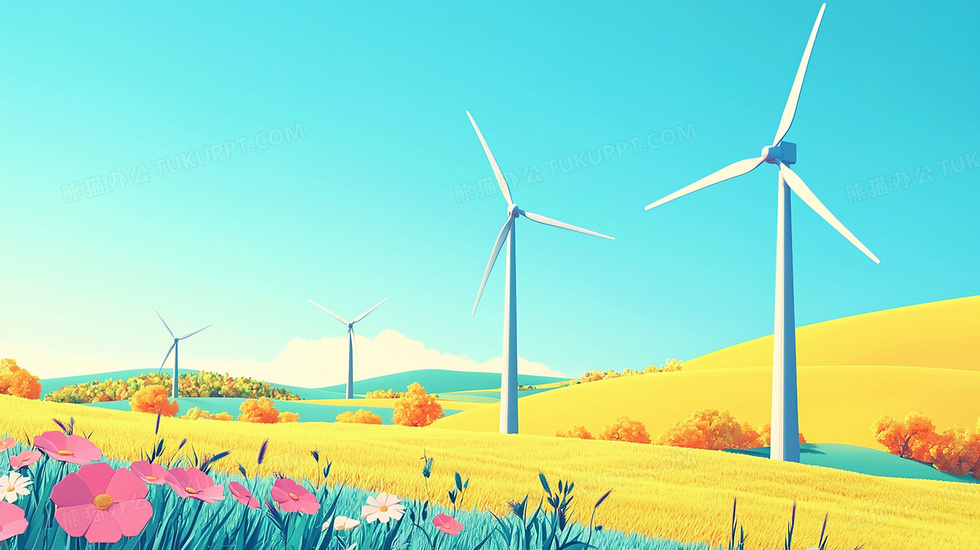 本作品内容为扁平化新能源电力风车环保背景, 格式为 jpg, 大小2 MB, 图片尺寸为2912 x 1632, 作品中背景图片无需修改, 源文件无水印,可以直接使用, 欢迎使用熊猫办公。 如认为平台内容涉嫌侵权,可通过邮件:tousu@tukuppt.com提出书面通知,我们将及时处理。