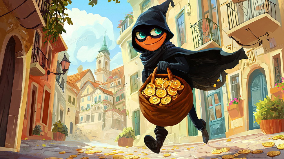 本作品内容为虚拟人物偷金币的盗贼卡通插画, 格式为 jpg, 大小3 MB, 图片尺寸为2912 x 1632, 源文件无水印, 欢迎使用熊猫办公。 如认为平台内容涉嫌侵权,可通过邮件:tousu@tukuppt.com提出书面通知,我们将及时处理。