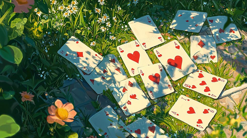 本作品内容为棋牌娱乐草坪上散落的扑克牌插画, 格式为 jpg, 大小4 MB, 图片尺寸为2912 x 1632, 源文件无水印, 欢迎使用熊猫办公。 如认为平台内容涉嫌侵权,可通过邮件:tousu@tukuppt.com提出书面通知,我们将及时处理。