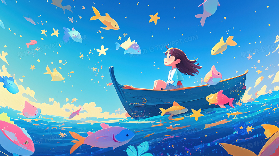 本作品内容为唯美天空下海上划船的女孩与小鱼插画, 格式为 jpg, 大小3 MB, 图片尺寸为2912 x 1632, 源文件无水印, 欢迎使用熊猫办公。 如认为平台内容涉嫌侵权,可通过邮件:tousu@tukuppt.com提出书面通知,我们将及时处理。