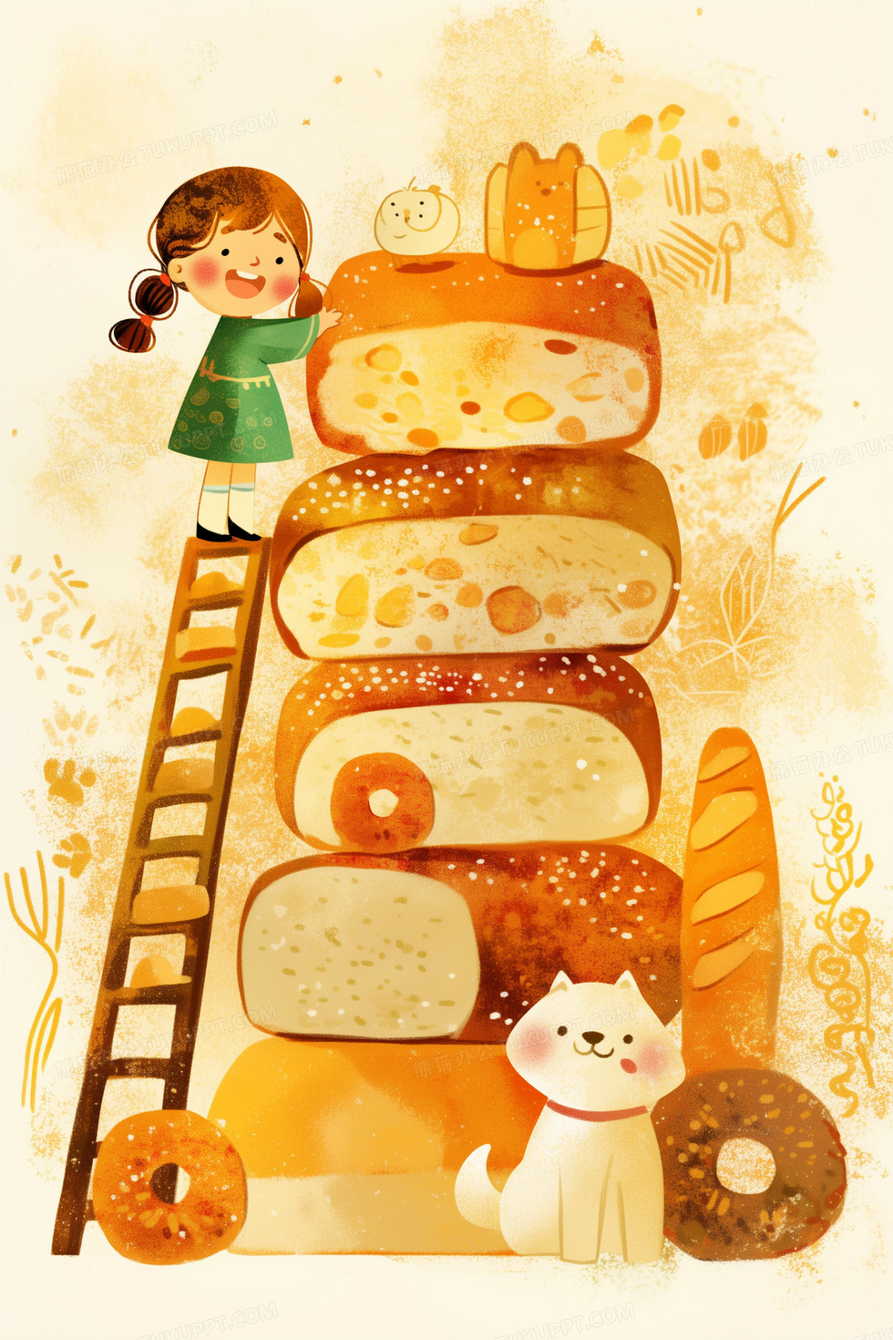 本作品内容为女孩在面包世界里踩着梯子往上爬创意插画, 格式为 jpg, 大小7 MB, 图片尺寸为1792 x 2688, 源文件无水印, 欢迎使用熊猫办公。 如认为平台内容涉嫌侵权,可通过邮件:tousu@tukuppt.com提出书面通知,我们将及时处理。