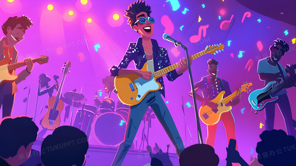 本作品内容为流行乐队在舞台上表演唱歌插画, 格式为 jpg, 大小1 MB, 图片尺寸为2912 x 1632, 源文件无水印, 欢迎使用熊猫办公。 如认为平台内容涉嫌侵权,可通过邮件:tousu@tukuppt.com提出书面通知,我们将及时处理。