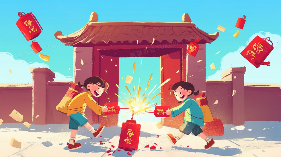 本作品内容为春节门口放炮竹的男孩女孩插画, 格式为 jpg, 大小3 MB, 图片尺寸为2912 x 1632, 源文件无水印, 欢迎使用熊猫办公。 如认为平台内容涉嫌侵权,可通过邮件:tousu@tukuppt.com提出书面通知,我们将及时处理。