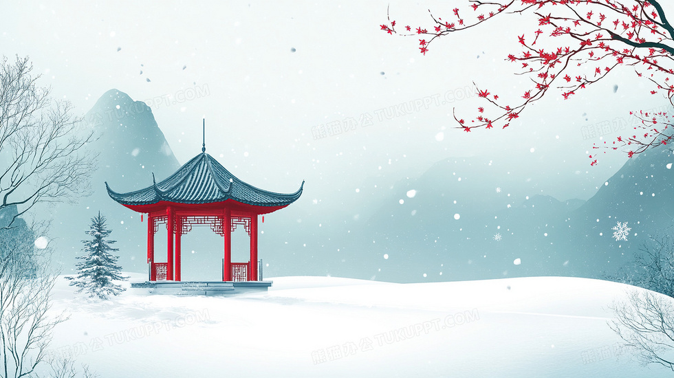 本作品内容为中国风亭子冬天雪地景色唯美背景, 格式为 jpg, 大小3 MB, 图片尺寸为2912 x 1632, 作品中背景图片无需修改, 源文件无水印,可以直接使用, 欢迎使用熊猫办公。 如认为平台内容涉嫌侵权,可通过邮件:tousu@tukuppt.com提出书面通知,我们将及时处理。