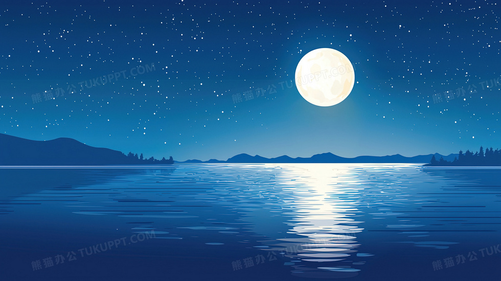 本作品内容为夜晚星空月亮照射湖面创意背景, 格式为 jpg, 大小3 MB, 图片尺寸为2912 x 1632, 作品中背景图片无需修改, 源文件无水印,可以直接使用, 欢迎使用熊猫办公。 如认为平台内容涉嫌侵权,可通过邮件:tousu@tukuppt.com提出书面通知,我们将及时处理。