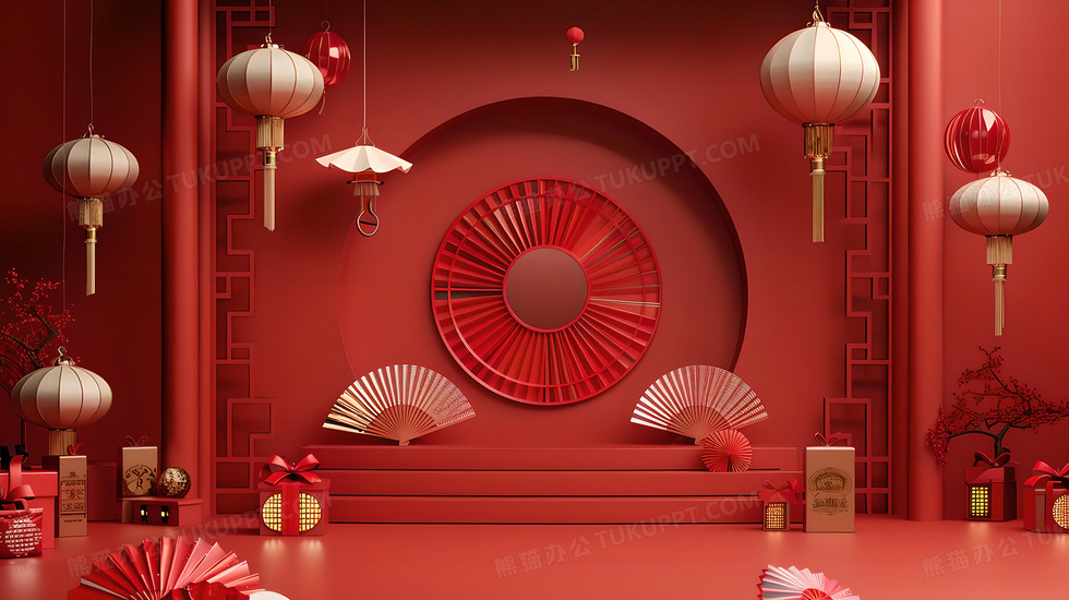 本作品内容为中国风折扇扇子礼物红色喜庆C4D商品展台背景, 格式为 jpg, 大小3 MB, 图片尺寸为2912 x 1632, 作品中背景图片无需修改, 源文件无水印,可以直接使用, 欢迎使用熊猫办公。 如认为平台内容涉嫌侵权,可通过邮件:tousu@tukuppt.com提出书面通知,我们将及时处理。