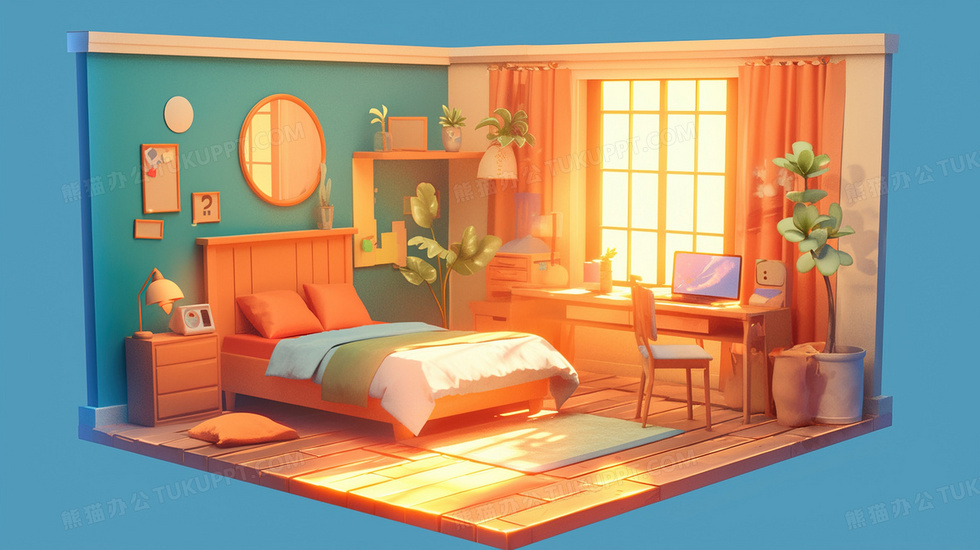 本作品内容为2.5D现代欧式家居舒适卧室床铺场景插画, 格式为 jpg, 大小2 MB, 图片尺寸为2912 x 1632, 源文件无水印, 欢迎使用熊猫办公。 如认为平台内容涉嫌侵权,可通过邮件:tousu@tukuppt.com提出书面通知,我们将及时处理。