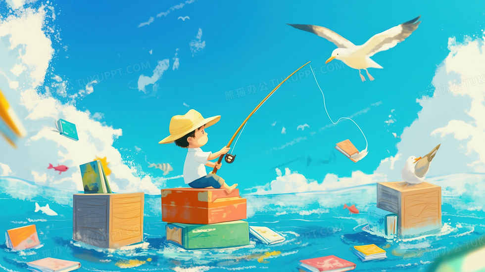 本作品内容为坐在海洋书本上钓鱼的卡通男孩插画, 格式为 jpg, 大小3 MB, 图片尺寸为2912 x 1632, 源文件无水印, 欢迎使用熊猫办公。 如认为平台内容涉嫌侵权,可通过邮件:tousu@tukuppt.com提出书面通知,我们将及时处理。
