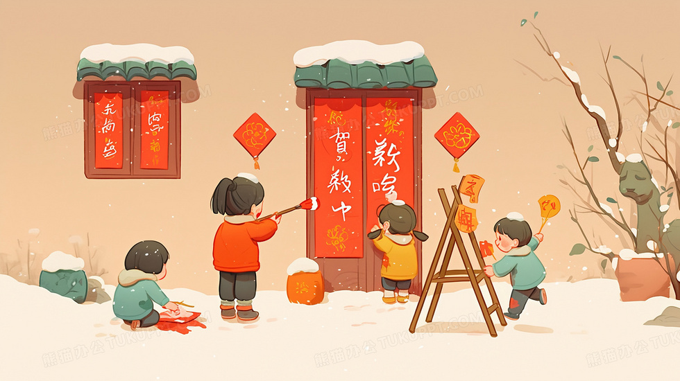 本作品内容为春节门口贴对联的儿童插画, 格式为 jpg, 大小2 MB, 图片尺寸为2912 x 1632, 源文件无水印, 欢迎使用熊猫办公。 如认为平台内容涉嫌侵权,可通过邮件:tousu@tukuppt.com提出书面通知,我们将及时处理。