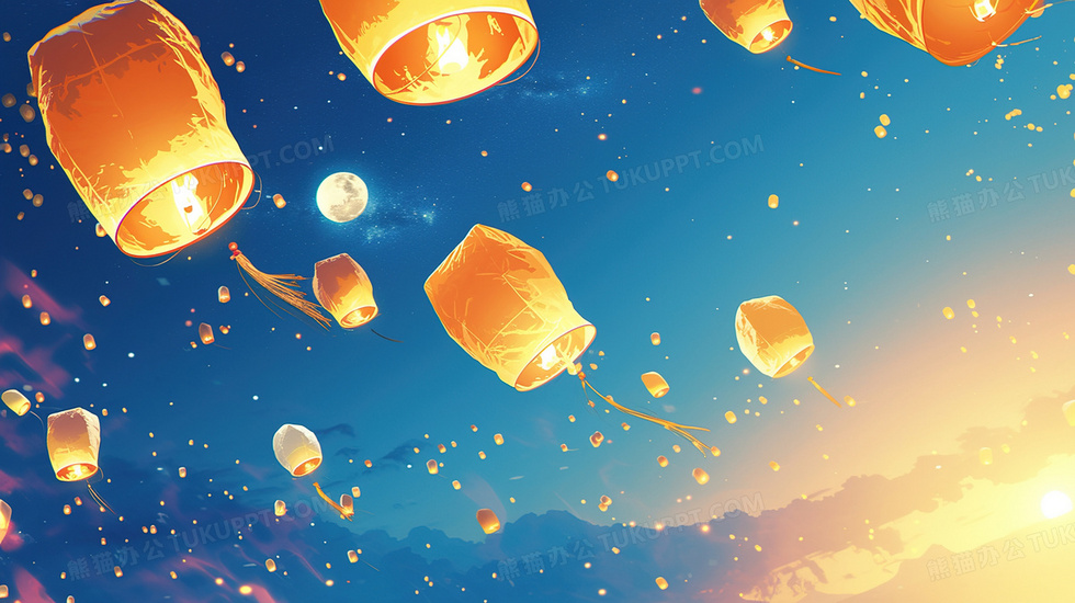 本作品内容为空中飘浮的祈福孔明灯插画, 格式为 jpg, 大小3 MB, 图片尺寸为2912 x 1632, 源文件无水印, 欢迎使用熊猫办公。 如认为平台内容涉嫌侵权,可通过邮件:tousu@tukuppt.com提出书面通知,我们将及时处理。