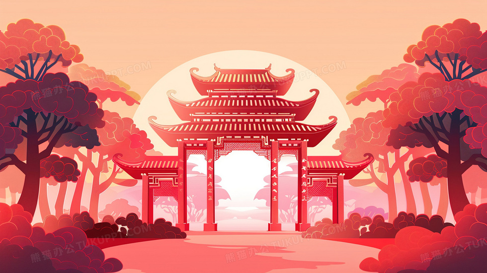 本作品内容为红色中式门楼建筑插画, 格式为 jpg, 大小3 MB, 图片尺寸为2912 x 1632, 源文件无水印, 欢迎使用熊猫办公。 如认为平台内容涉嫌侵权,可通过邮件:tousu@tukuppt.com提出书面通知,我们将及时处理。