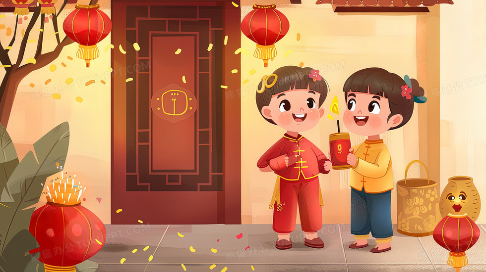 本作品内容为春节门口放炮竹的两个小孩插画, 格式为 jpg, 大小3 MB, 图片尺寸为2912 x 1632, 源文件无水印, 欢迎使用熊猫办公。 如认为平台内容涉嫌侵权,可通过邮件:tousu@tukuppt.com提出书面通知,我们将及时处理。