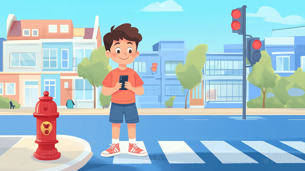 本作品内容为小男孩过马路玩手机闯红灯插画, 格式为 jpg, 大小2 MB, 图片尺寸为2912 x 1632, 源文件无水印, 欢迎使用熊猫办公。 如认为平台内容涉嫌侵权,可通过邮件:tousu@tukuppt.com提出书面通知,我们将及时处理。