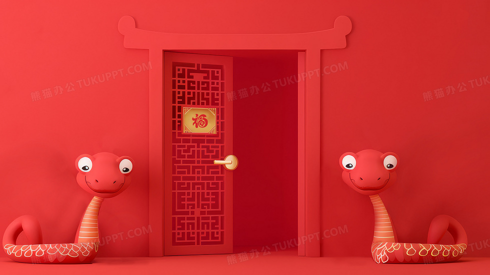 本作品内容为3D蛇年红色大门和蛇结合背景, 格式为 jpg, 大小5 MB, 图片尺寸为2912 x 1632, 作品中背景图片无需修改, 源文件无水印,可以直接使用, 欢迎使用熊猫办公。 如认为平台内容涉嫌侵权,可通过邮件:tousu@tukuppt.com提出书面通知,我们将及时处理。