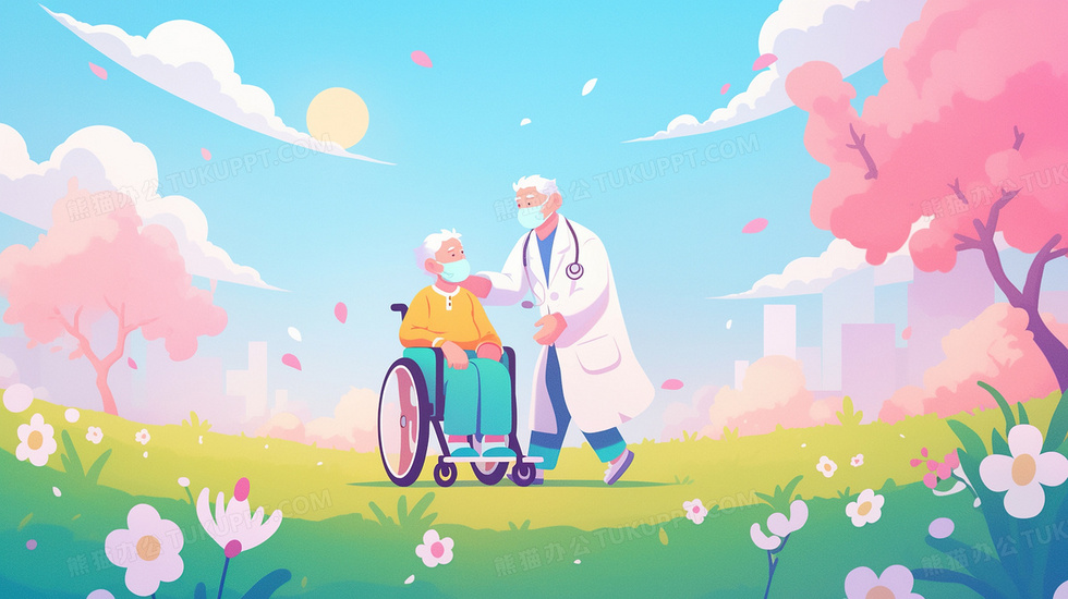 本作品内容为医生照顾生病的坐轮椅老人插画, 格式为 jpg, 大小3 MB, 图片尺寸为2912 x 1632, 源文件无水印, 欢迎使用熊猫办公。 如认为平台内容涉嫌侵权,可通过邮件:tousu@tukuppt.com提出书面通知,我们将及时处理。